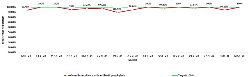 حافظ مستشفى القلب على معدلات امتثال عالية فيما يتعلق بالعلاج الوقائي بالمضادات الحيوية، حيث حقق 98 ٪ في عام 2023 و97.8 ٪ في أوائل عام 2024. تقترب هذه النتائج شيئًا فشيئًا من هدفنا المتمثل في 100 ٪، مما يدعم النتائج الجراحية الأكثر أمانًا والوقاية الفعالة من العدوى.