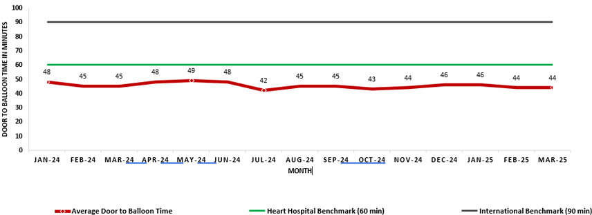 في مستشفى القلب، كان متوسط الوقت المستغرق بين حضور المريض وخضوعه للعملية 45 دقيقة في عام 2023 وتحسن قليلاً إلى 44.6 دقيقة في أوائل عام 2025، متجاوزًا بشكل كبير المعيار الدولي البالغ 90 دقيقة. يعكس هذا الإنجاز التزامنا بتقديم علاج سريع ومنقذ للحياة لمرضى النوبات القلبية وتقليل الأضرار التي لحقت بعضلة القلب.