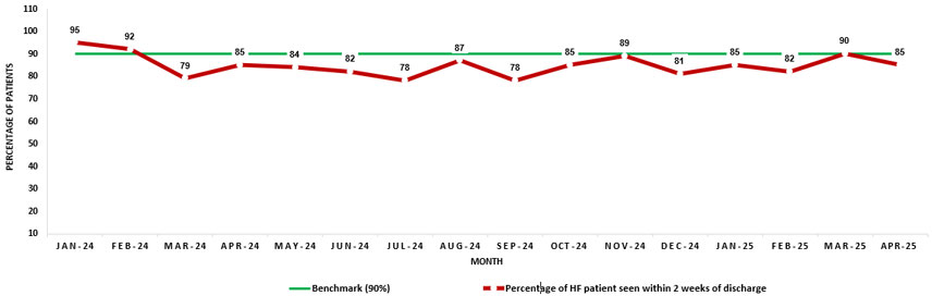 مع الاقتراب من معيارنا البالغ 90 ٪، فإن الطلب المرتفع باستمرار على مواعيد المتابعة يؤكد الحاجة إلى توسيع نطاق الوصول وتحسين الموارد الطبية لضمان تقديم رعاية صحية آمنة وحانية وفعالة في الوقت المناسب بعد الخروج من المستشفى.