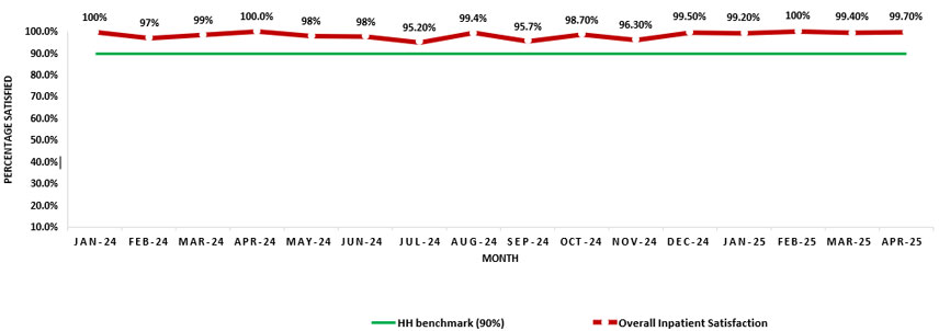 ظل رضا المرضى الداخليين في مستشفى القلب مرتفعًا طوال عام 2024 وأوائل عام 2025، متجاوزًا باستمرار معيارنا البالغ 90 ٪. مما يشير إلى الثقة القوية والتقدير الذي يحظى به مرضانا في الرعاية التي نقدمها.