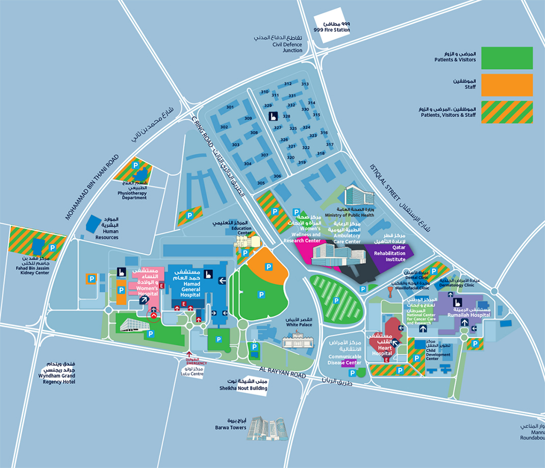 يُرجى الإطلاع على الخريطة أدناه للعثور على أقرب موقف إليك في مرافق مؤسسة حمد الطبية الرئيسية.