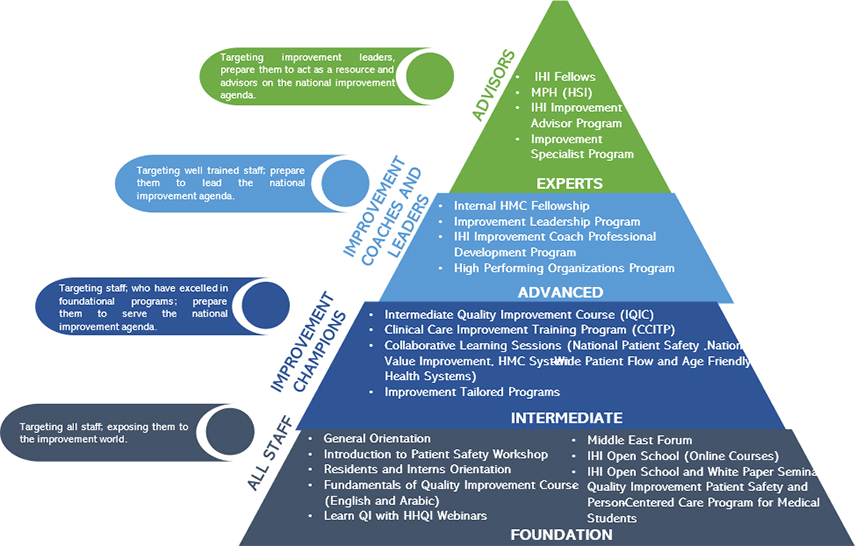 Increasing the capacity and capability of staff require different strategies to make them operational. HHQI adopted the Institute of Healthcare Improvement's "dosing" approach to deploy targeted levels of quality improvement knowledge and skills throughout the system, providing healthcare staff with the knowledge, methods and skills associated with the science of improvement they will need to make improvements in their work. The key point of the approach is that not everyone in the organization needs to have the same depth of knowledge about science of improvement concepts, methods, and tools.